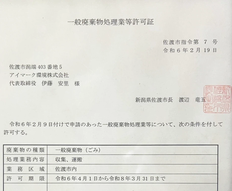 佐渡市から“一般廃棄物収集運搬業許可”取得済み!!